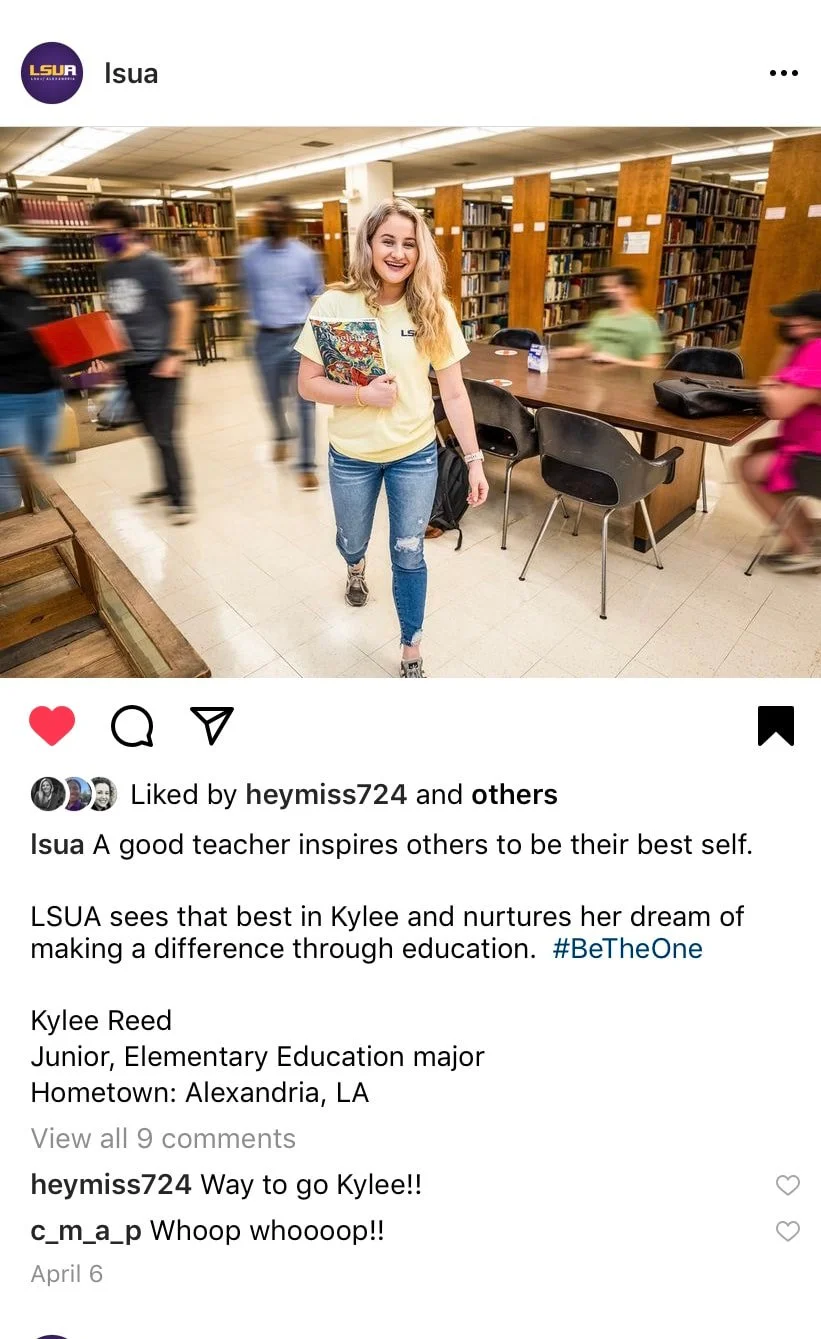 An original 2021 student led social media campaign in cooperation with the Office of Strategic Communications at Louisiana State University of Alexandria. Key students were interviewed and highlighted through both feature stories and Instagram content. This campaign was featured on LSUA's Instagram and Facebook pages over the course of eight weeks.