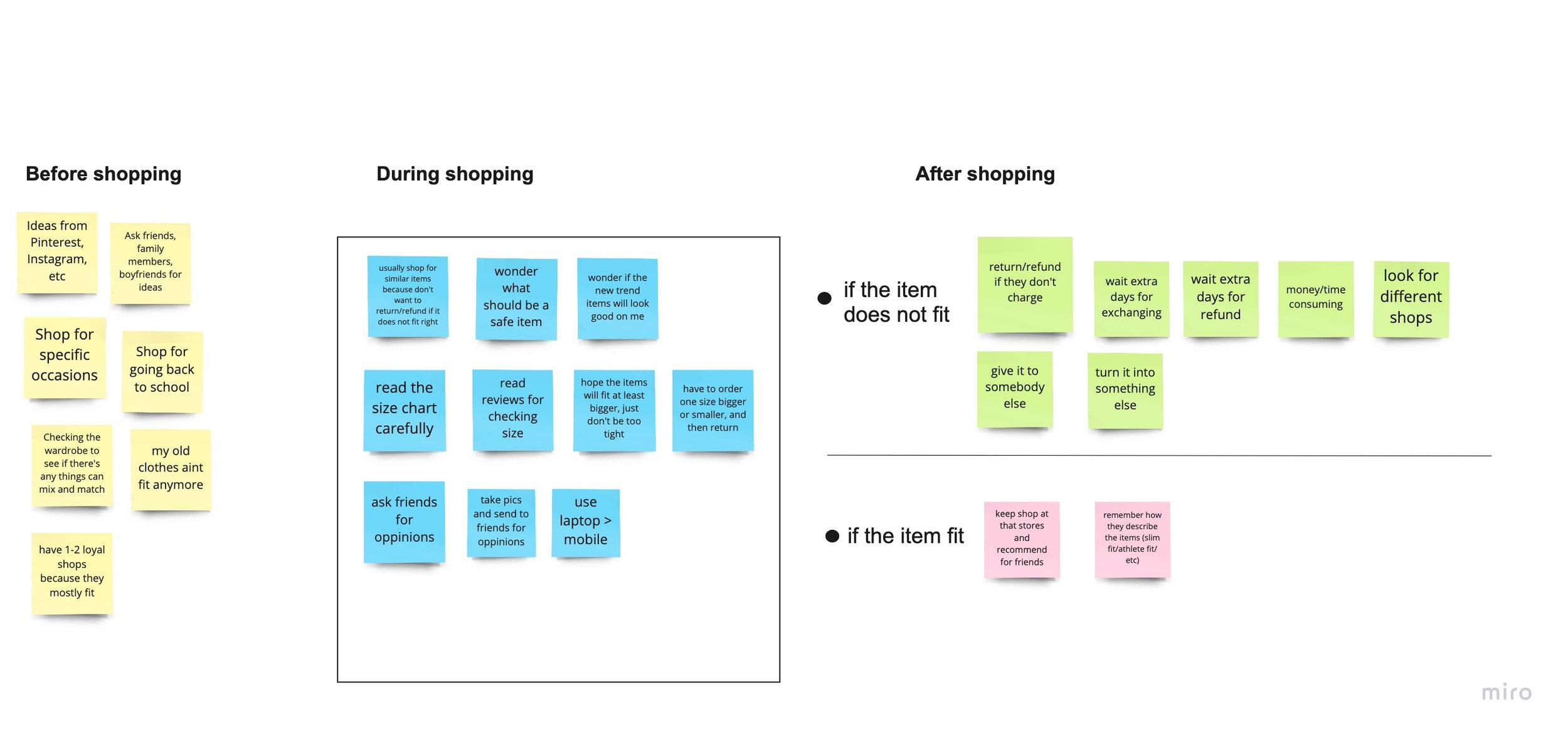 40 responses + 5 interviews where participants had to answer questions regarding their online clothing habits and what matters the most to them during their shopping experience.